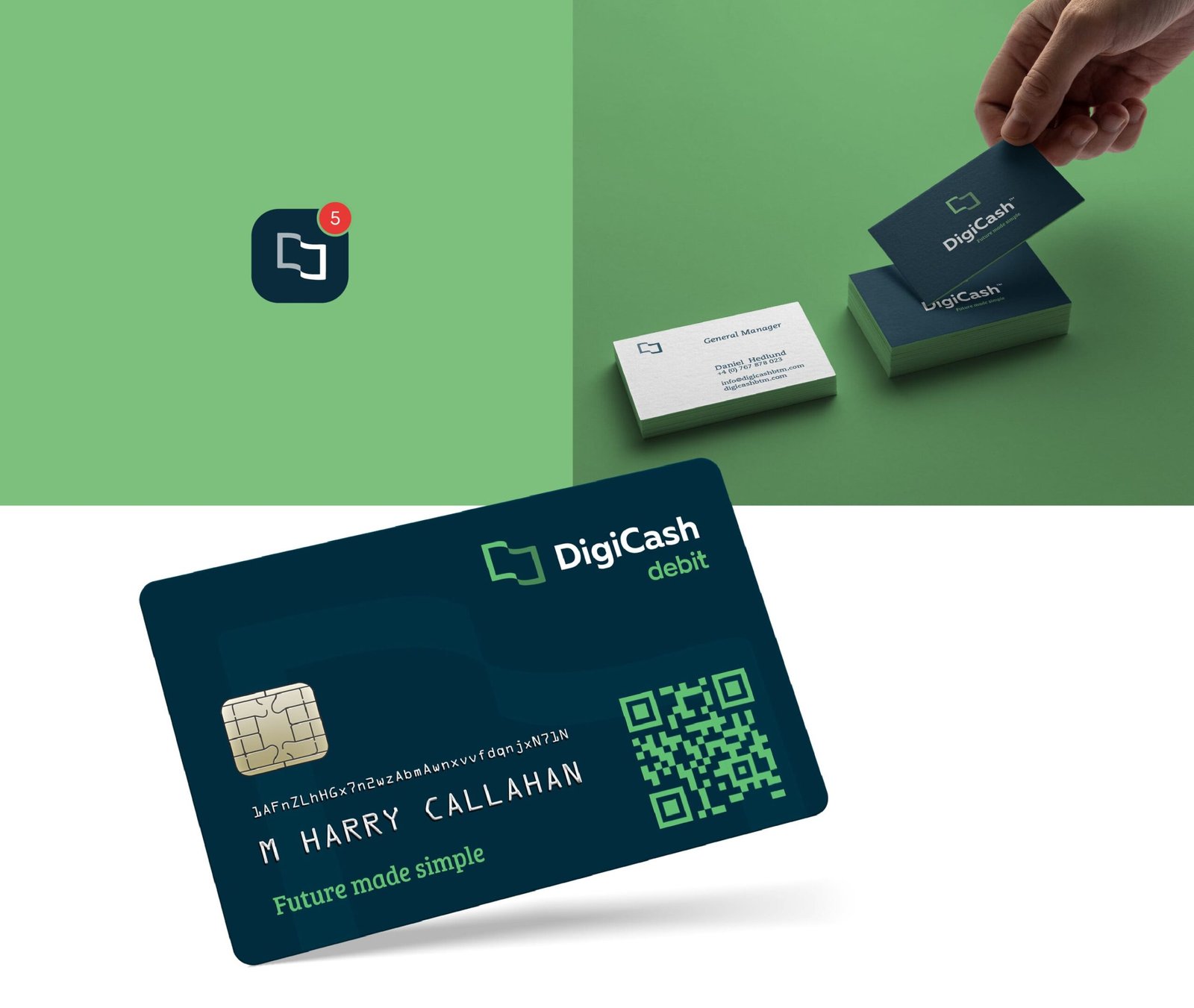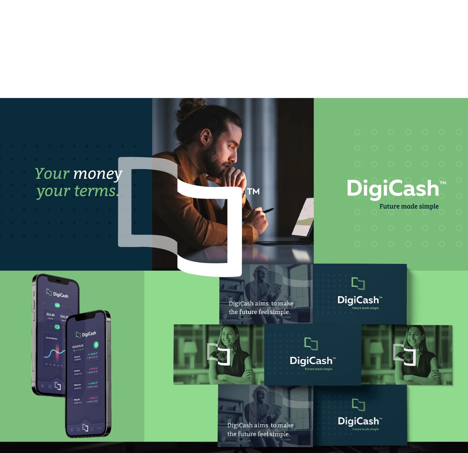 The logo for this cryptocurrency brand needed to be simple and memorable. The symbol resembles a traditional banknote that transforms into a digital banknote and contains the elements of the blockchain inside.